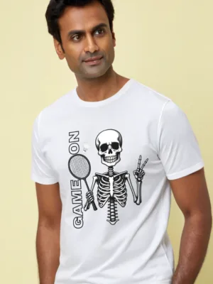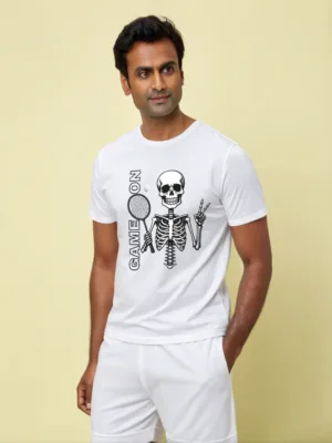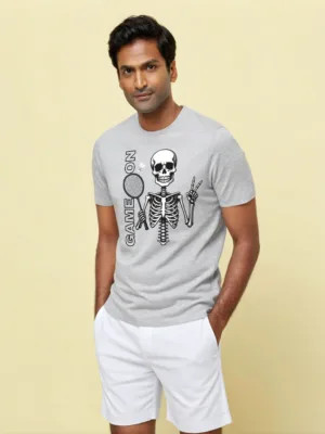 Let the game begin! 🏸 Our Men’s Grey and White “Game On” Badminton T-shirt is ready to hit the court.