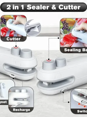 The 2-in-1 Heat Sealer with Cutter features both heat sealing and blade cutting capabilities. This handheld device makes it simple to keep your food fresh; you can seal vacuum bags or chip bags directly to help prevent spoilage.